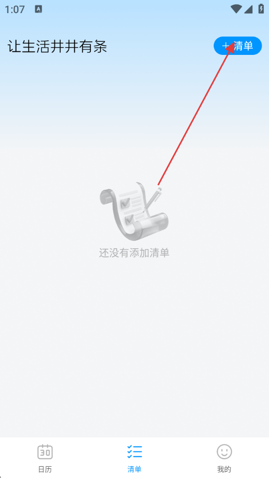 2、进入清单页面,然后点击右上角【+清单】。