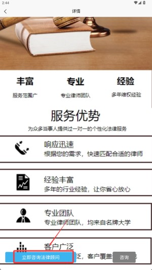 3.咨询法律支持:在详情页点击「立即咨询法律顾问」,跳转至在线咨询界面。