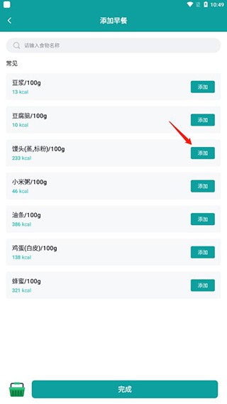 4.完成记录:确认食物及分量后,点击「完成」保存当前餐次数据。