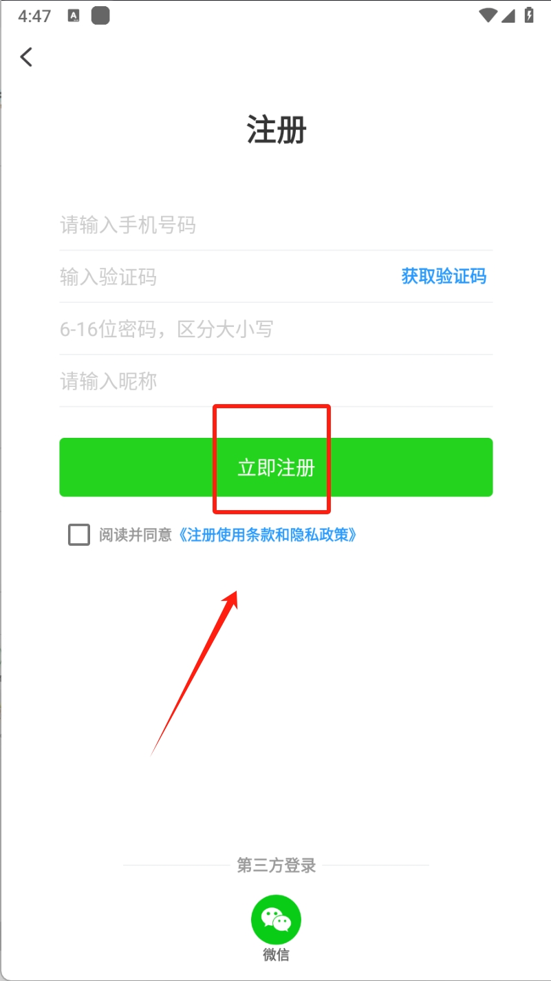 3、注册新账户:点击“立即注册”,输入必要信息并同意条款完成注册。