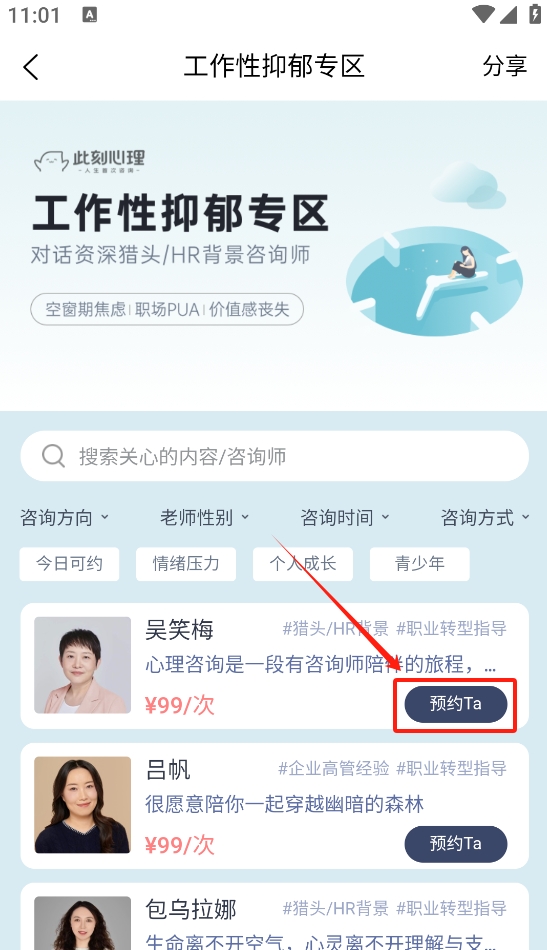 3、选择感兴趣的咨询师并点击“预约Ta”按钮进行预约。