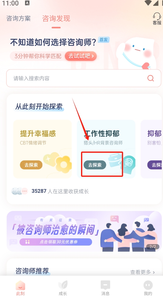 2、选择咨询师:根据个人需求浏览咨询师资料,查看擅长领域和用户评价,匹配最适合的专业人士。