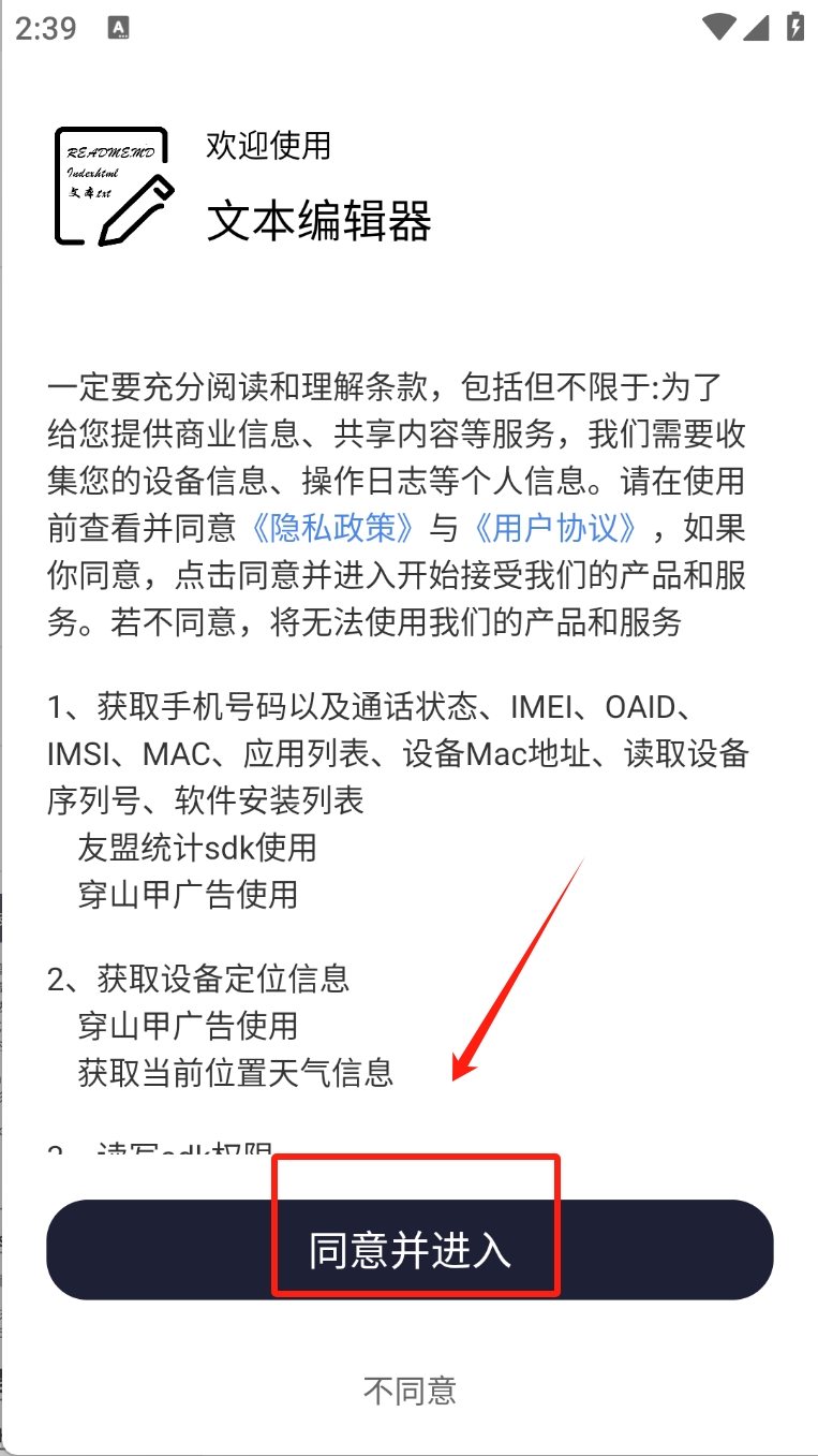 1、阅读并同意文本编辑器的用户协议和隐私政策。点击“同意并进入”以继续。