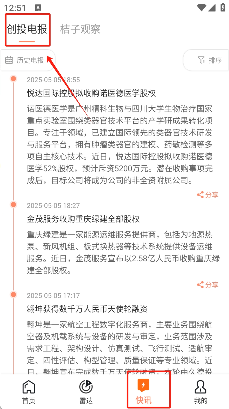 2、阅读创投电报:点击“创投电报”标签,查看最新的创业投资动态。