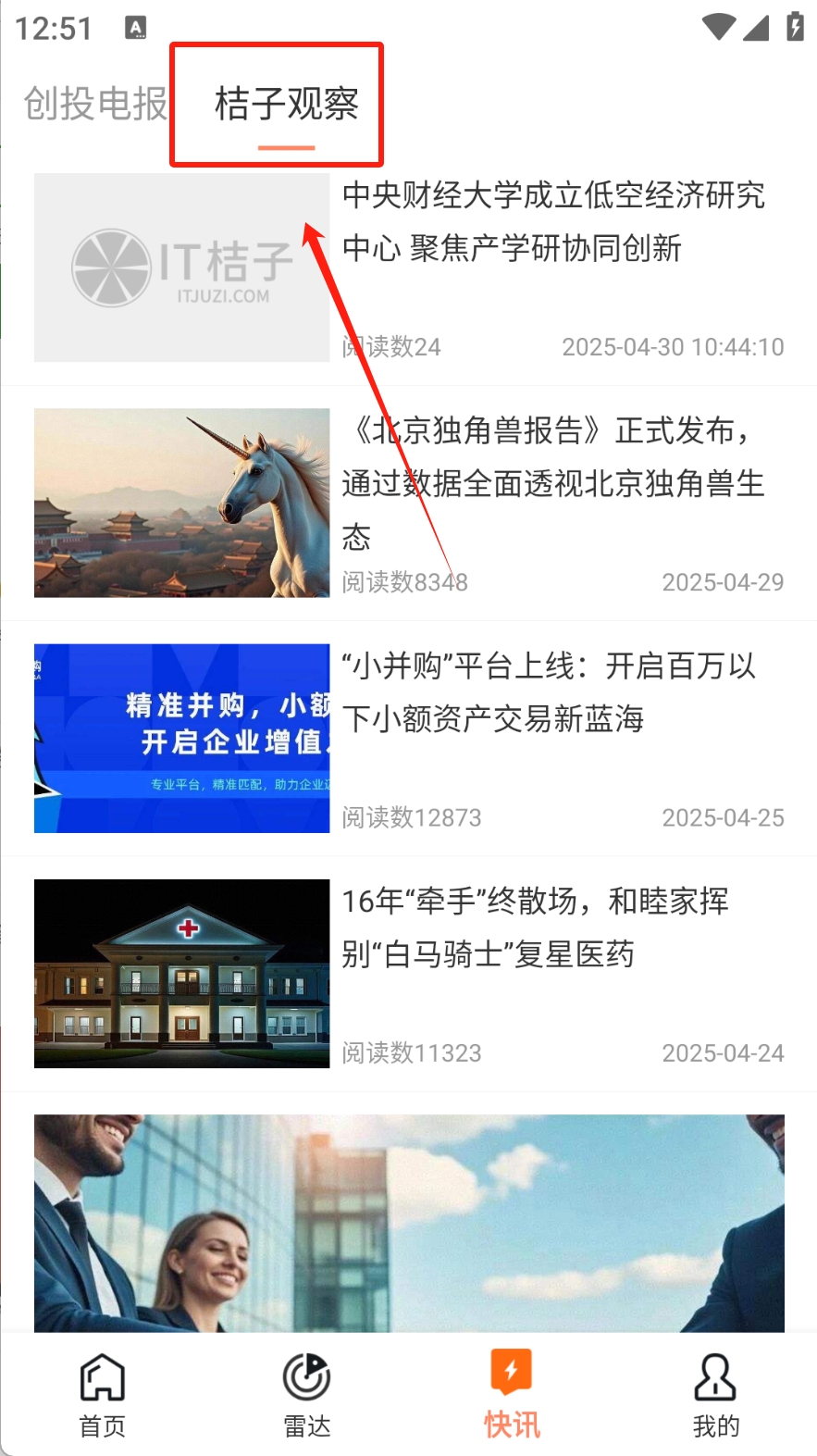 3、浏览桔子观察:点击“桔子观察”标签,获取深度财经分析和评论。