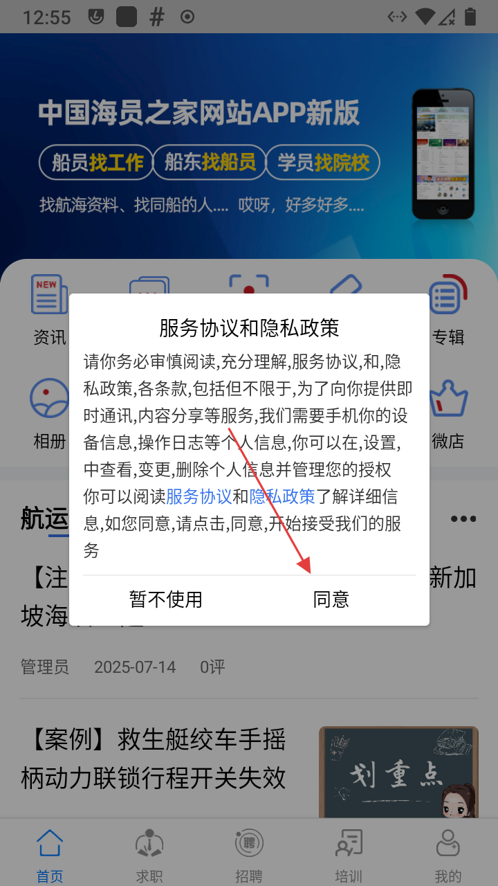 1、打开应用,若弹出服务协议弹窗,点击【同意】,接受条款。