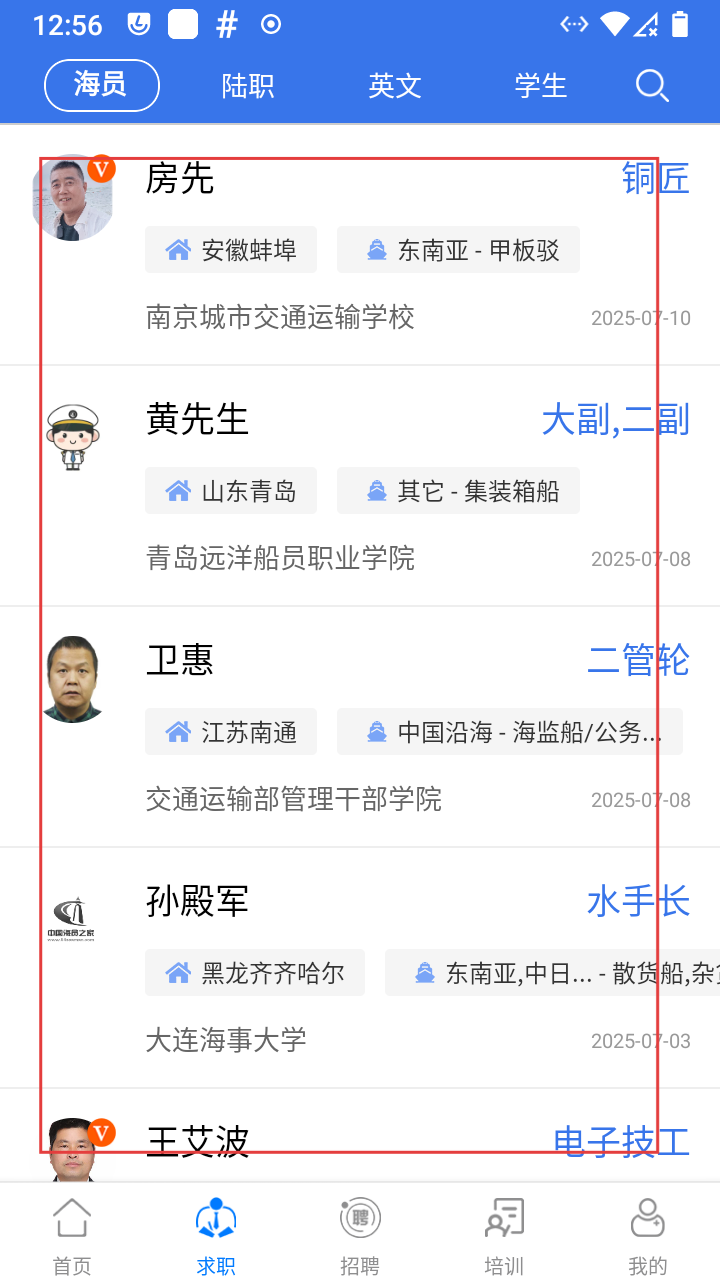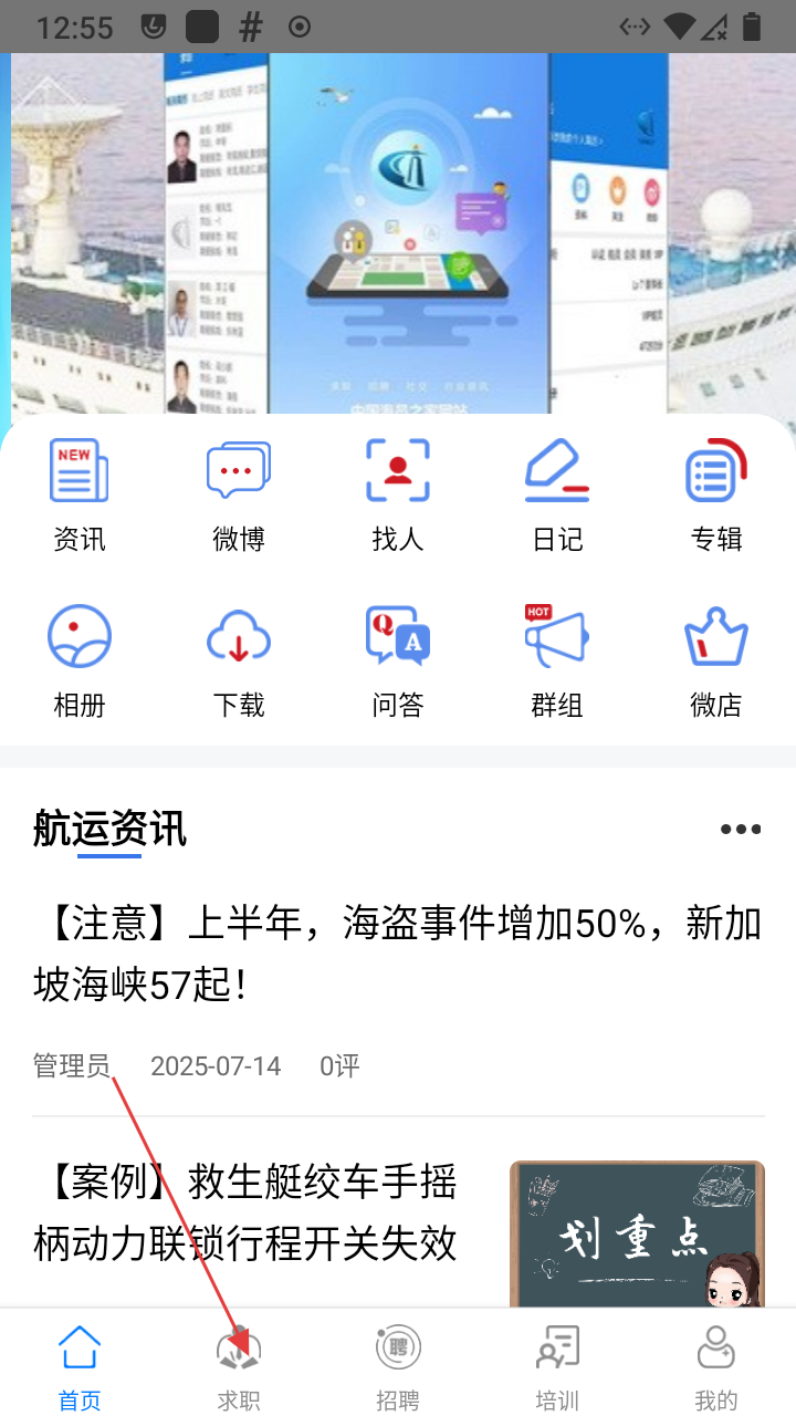 2、进入首页,想找工作,点击底部【求职】,浏览海员等岗位。