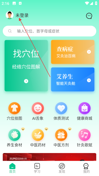 1、打开应用进入首页点击未登录。