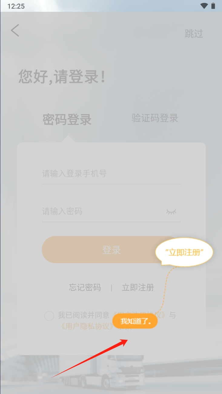 2、进行账号登录:点击“立即注册”进行账号注册,或输入手机号和密码登录。