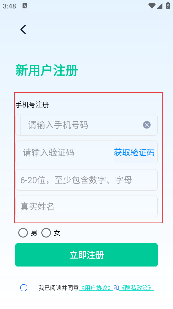 4、选择性别,勾选【我已阅读并同意《用户协议》和《隐私政策》】,最后点击【立即注册】按钮。