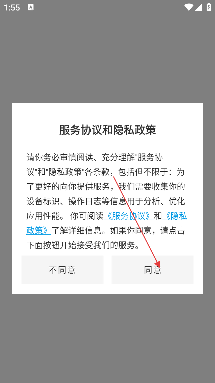 1、首先会弹出【服务协议和隐私政策】界面,仔细阅读后,点击【同意】按钮。