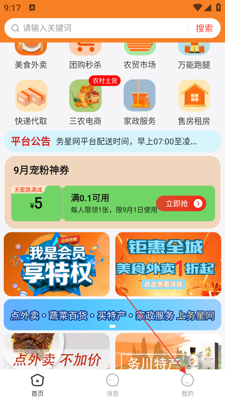 1、进入软件首页,能看到【美食外卖】【团购秒杀】等功能入口,还有平台公告和优惠活动,可按需选择服务。