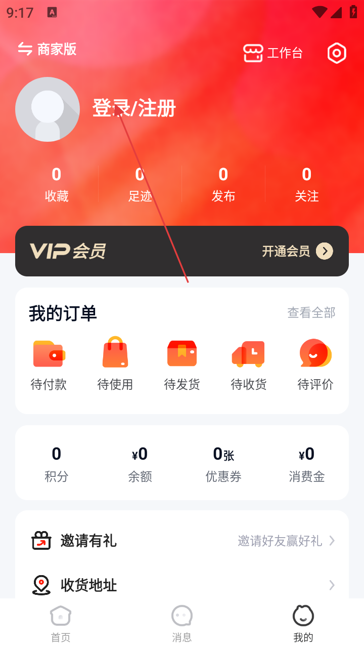 2、点击底部【我的】,进入个人页面,这里可进行【登录/注册】,还能查看订单、积分等信息。
