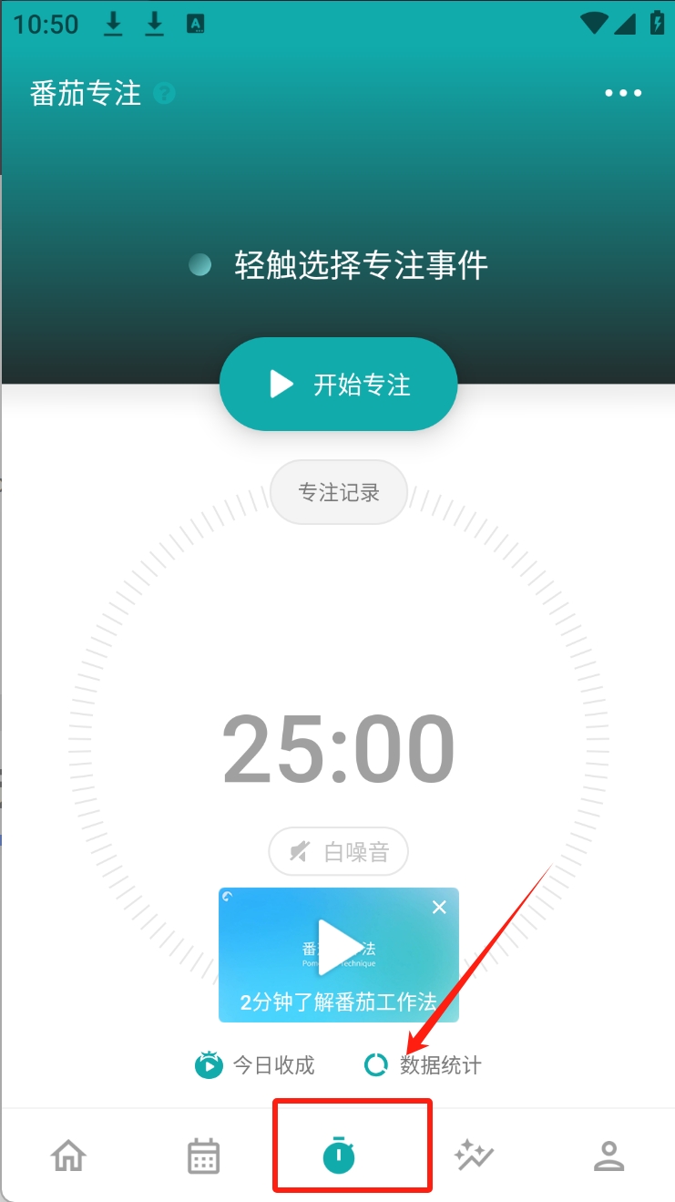 3、点击“专注”图标开始番茄工作法计时。