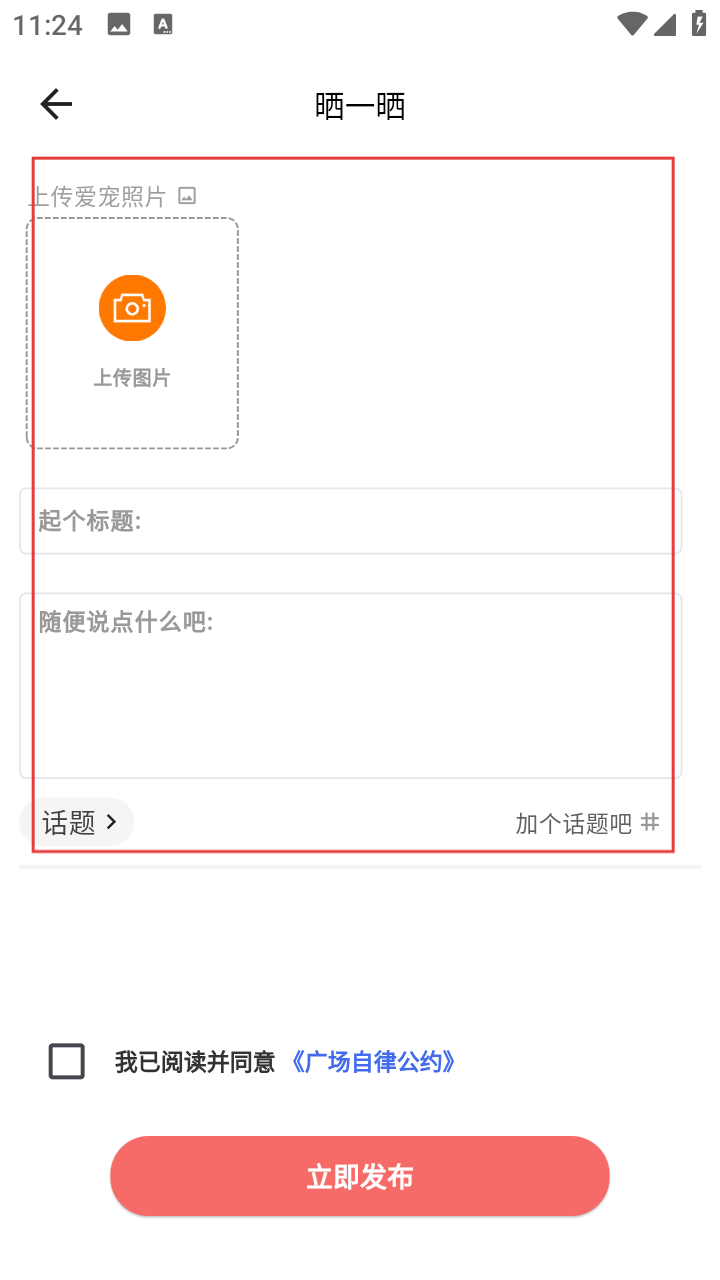 4、在【晒一晒】页,传照片、填标题、写内容、加话题,勾选协议后【立即发布】。