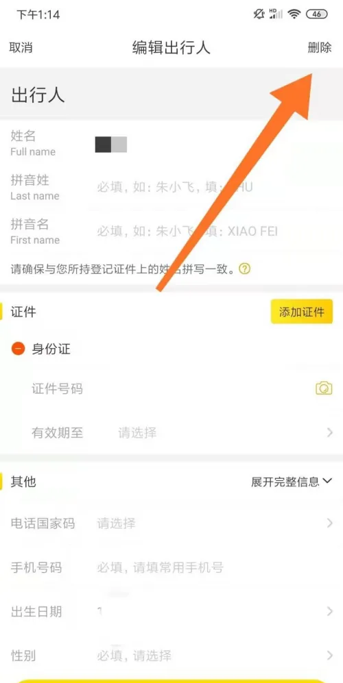 3、在常用信息里找出需要删除的人员点击进去编辑出行人,点击右上角【删除】即可