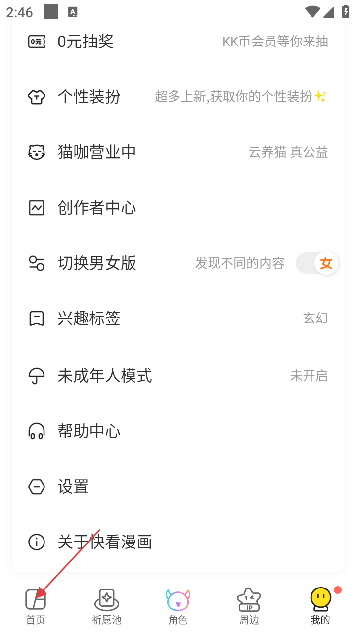 1、在软件首页,可浏览推荐漫画,点击右下角【我的】,进入个人相关页面。