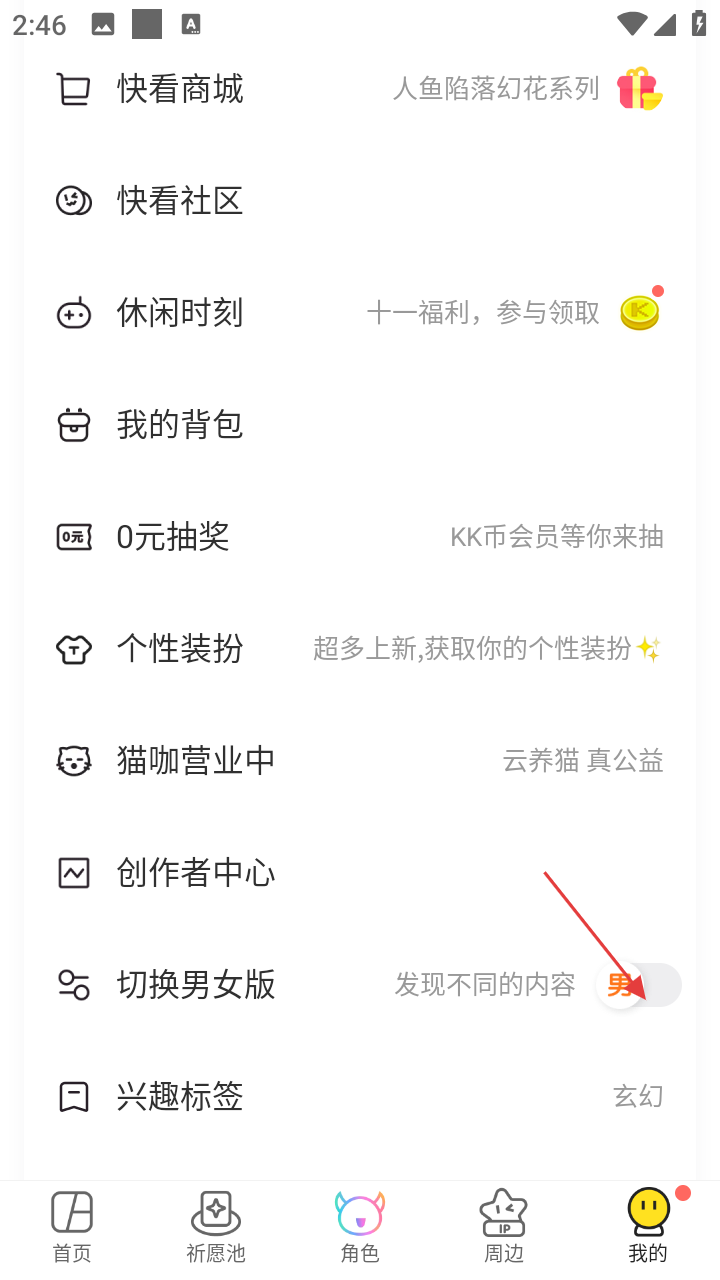 2、在个人相关页面,找到【切换男女版】选项,点击切换按钮可更改版本。