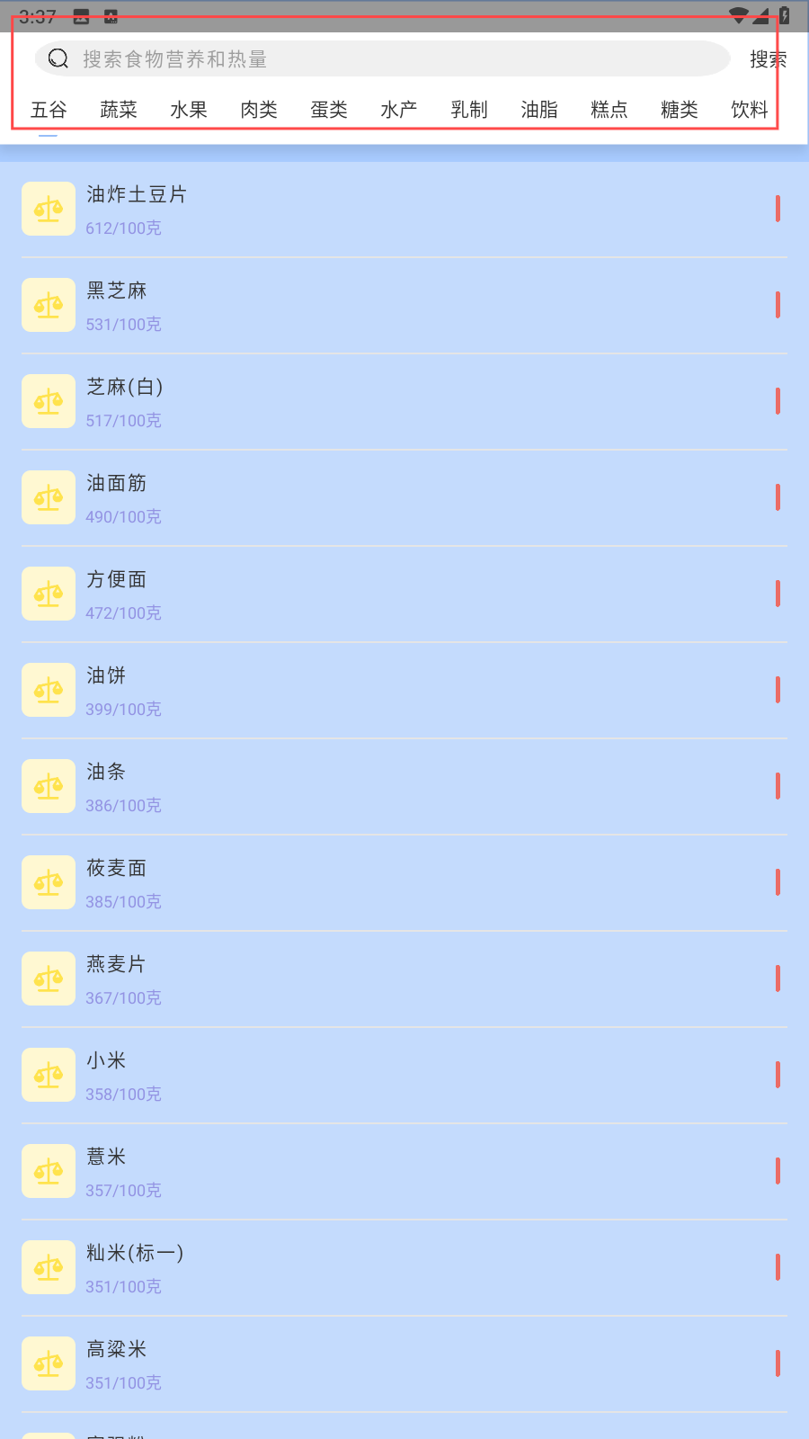 2、在上方搜索栏可以搜索食物的热量。