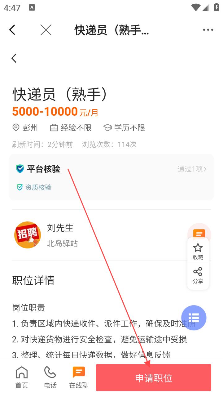 4、选感兴趣岗位,进入详情页看职责,点【申请职位】投递简历。