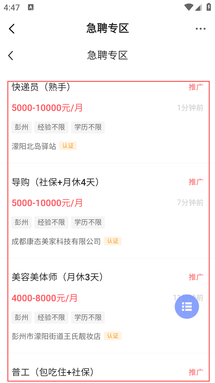 3、在急聘专区,查看各类岗位的薪资、要求,筛选适配的。