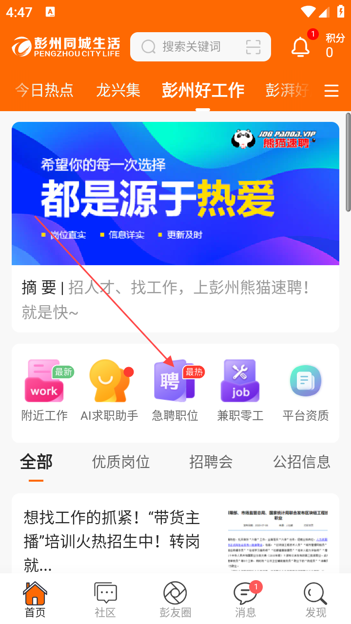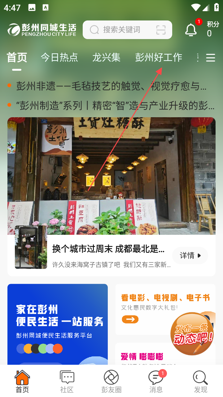 1、打开【彭州同城生活】,点顶部【彭州好工作】,进入求职板块找机会。