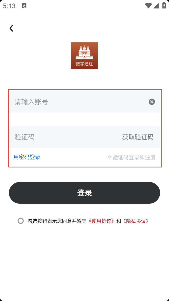 4、进入登录界面,在【请输入账号】输入框中填写账号,然后将收到的验证码填入【验证码】输入框,点击登录即可完成注册。