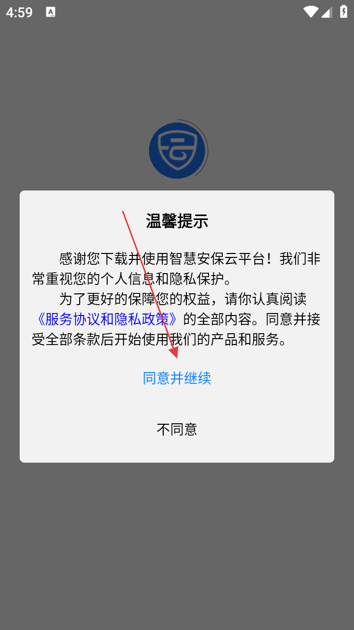 1、打开智慧安保云,弹出温馨提示弹窗,仔细阅读《服务协议和隐私政策》后,点击【同意并继续】。
