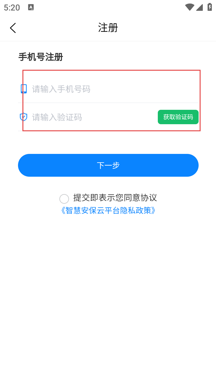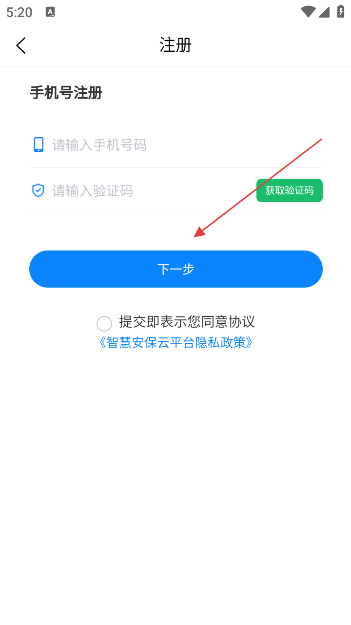 4、勾选【《智慧安保云平台隐私政策》】,确认信息无误后,点击【下一步】,按指引完成后续注册流程。