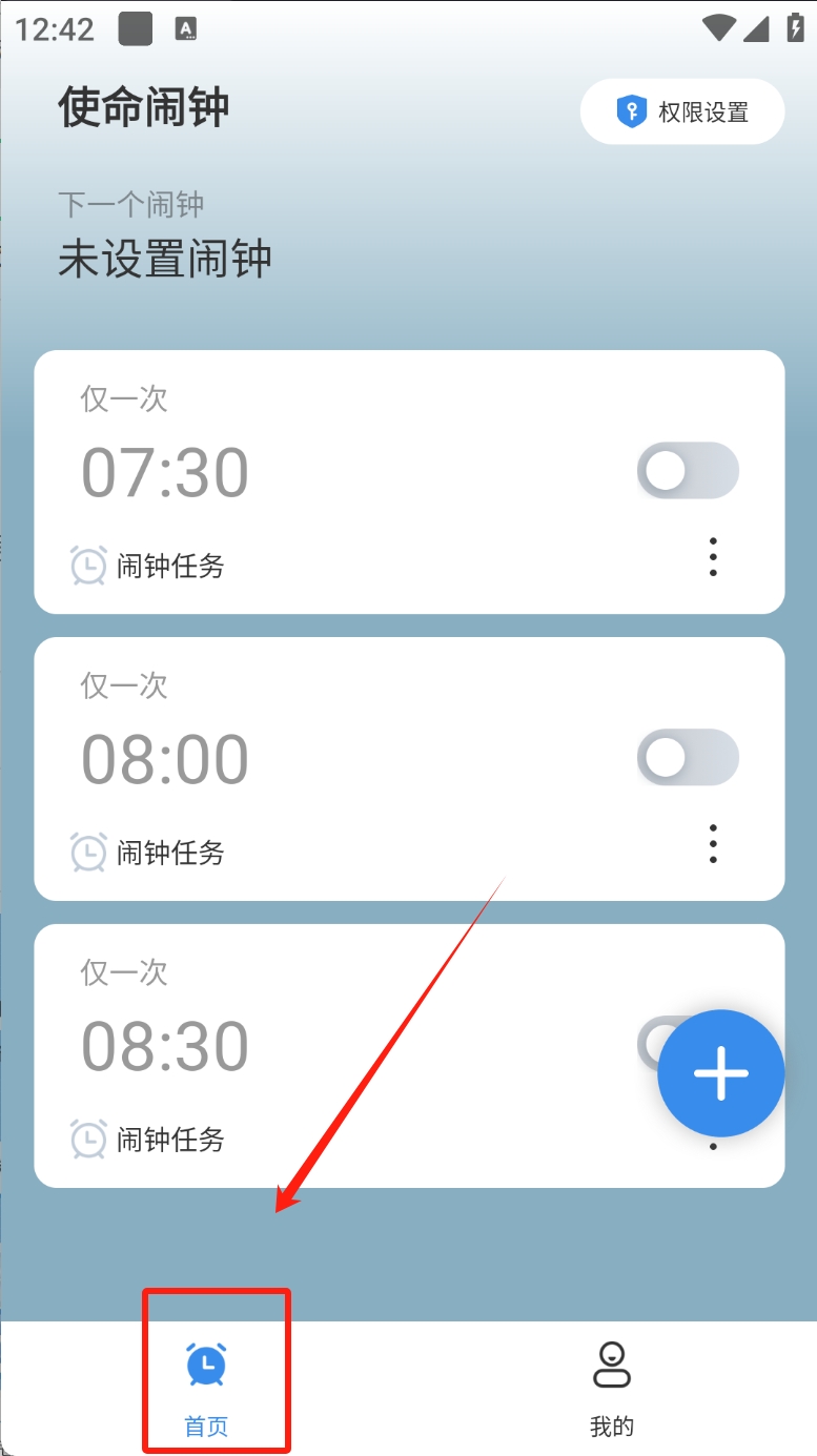 1、在首页点击“首页”按钮,查看已设置的闹钟列表和添加新闹钟。