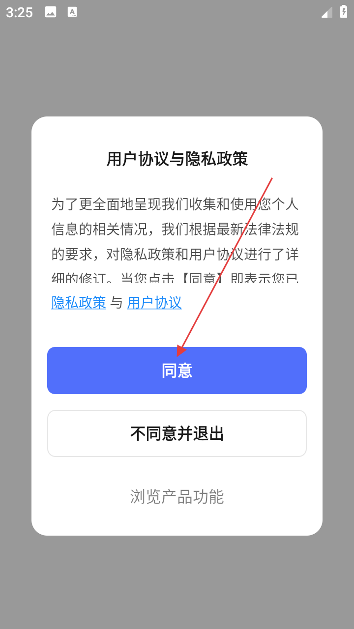 1、进入应用时,需点击【同意】,【用户协议与隐私政策】方可继续 。