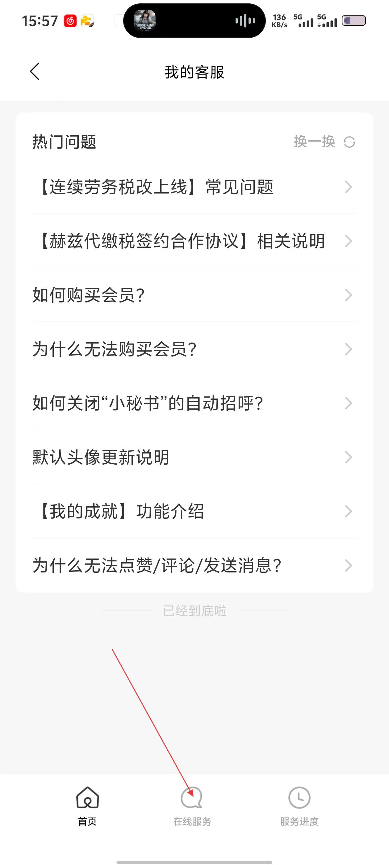 4、在我的客服页面,可查看热门问题等内容,也可点击【在线服务】获取客服帮助。