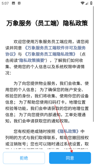 1、首次使用万象服务,阅读《万象服务员工端软件许可及服务协议》《万象服务员工端隐私政策》后,点击【同意】接受条款。