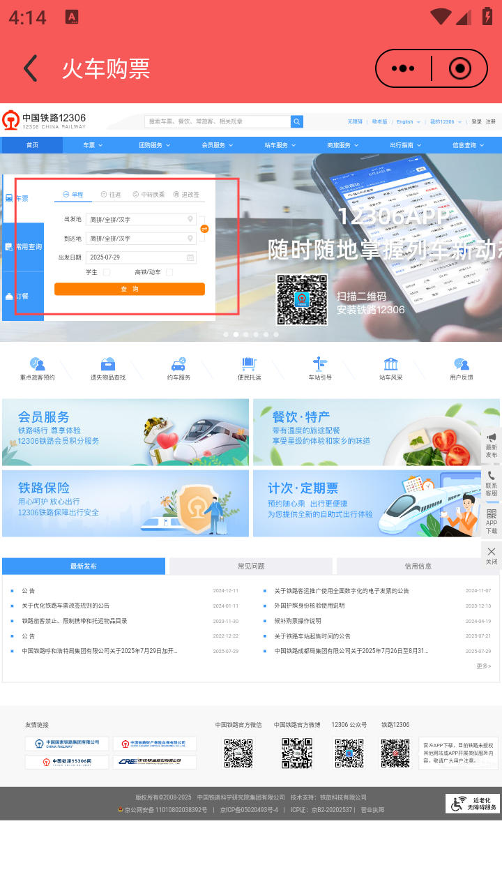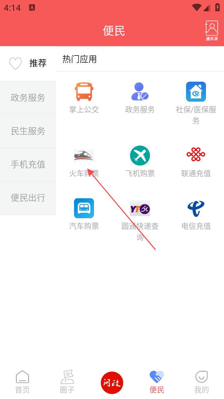 2、在便民页热门应用,点【火车购票】,跳转12306页面。