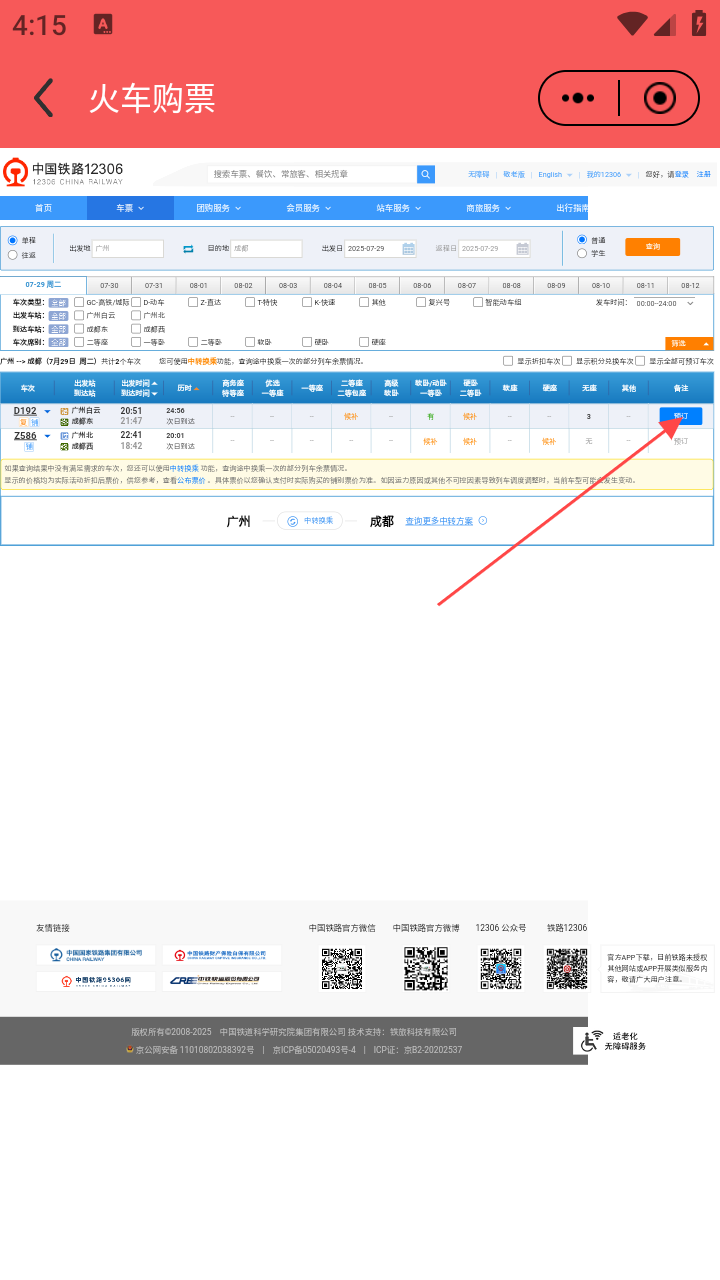 4、选合适车次,点对应席位【预订】,按流程购买。