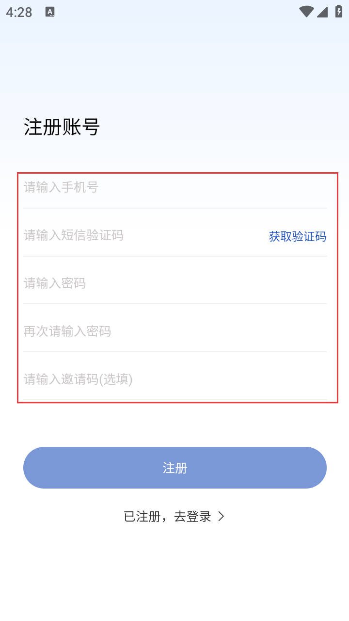 4、注册页依次填手机号、验证码、密码等,点【注册】完成账号创建。
