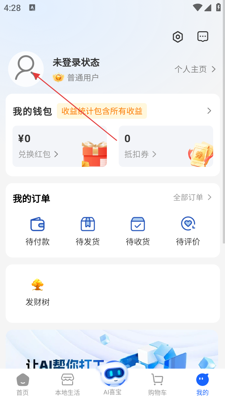 2、在【我的】页面,点击未登录状态下的头像区域,进入登录界面。