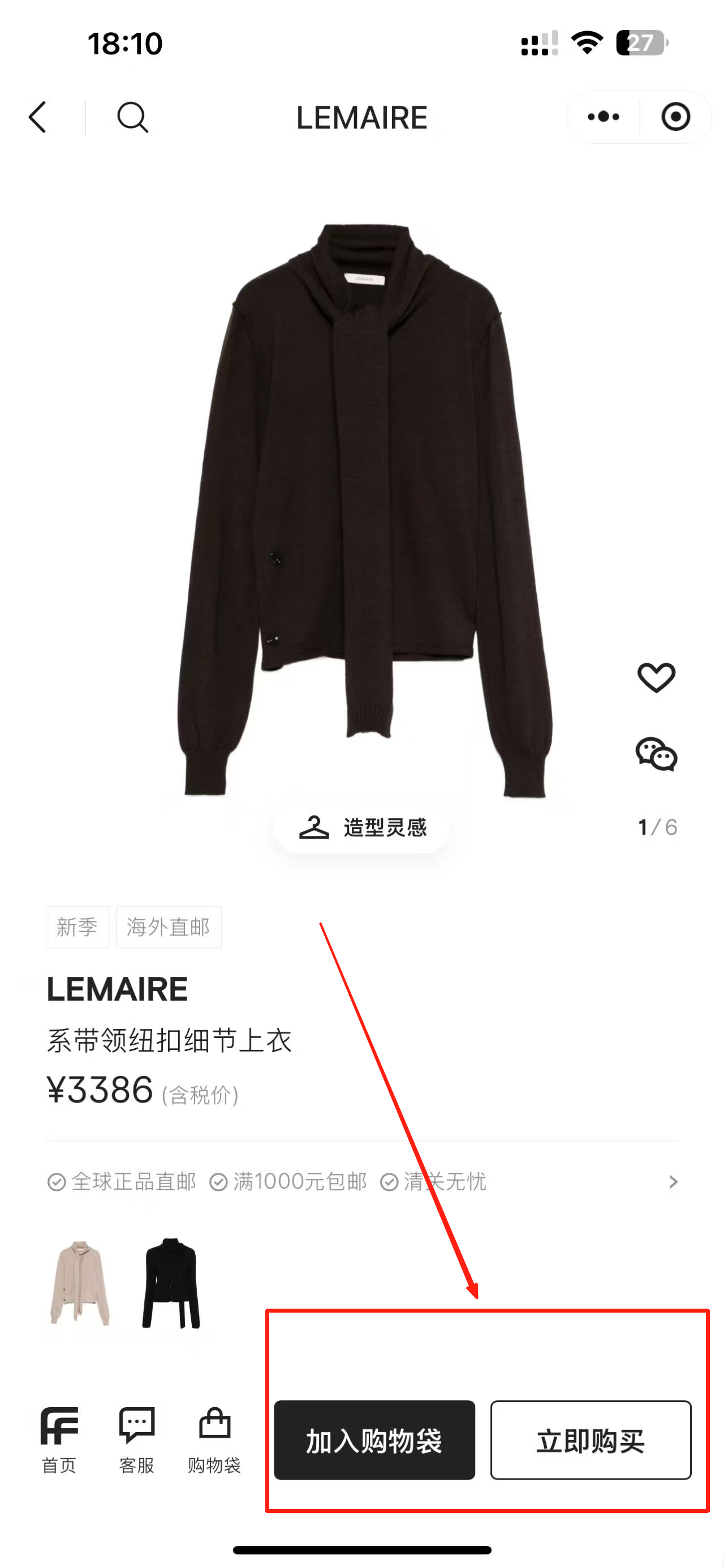 4、在商品详情页,选择“加入购物袋”或“立即购买”进行购买。