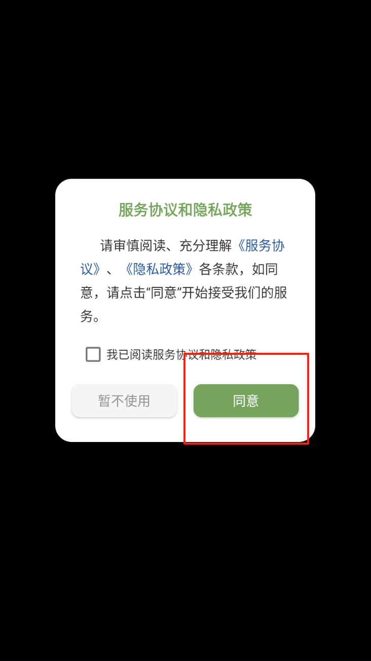 1、同意服务协议和隐私政策。阅读后点击“同意”以继续使用应用。