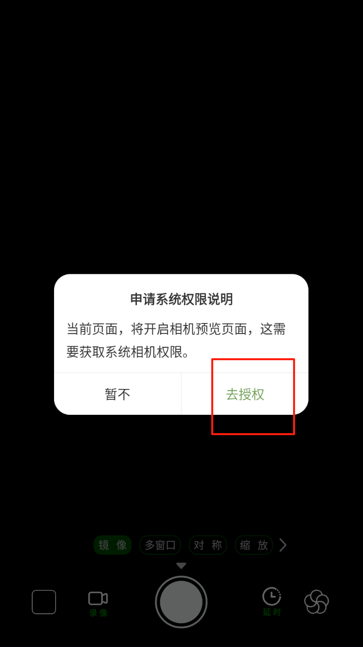 2、授权相机权限。点击“去授权”以开启相机预览功能。