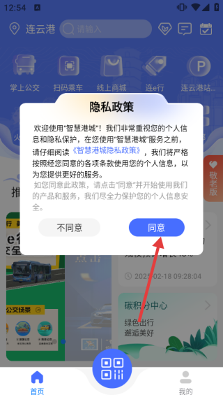 1、打开“智慧港城”应用,弹出【隐私政策】窗口,仔细阅读后点击【同意】,接受政策进入应用主界面。