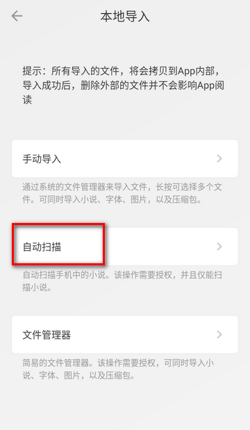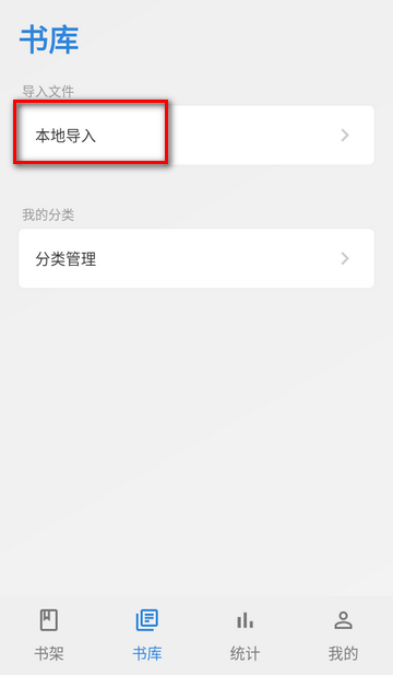 2、在书库界面中,选择“本地导入”选项,并点击“自动扫描”以开始查找本地书籍文件。