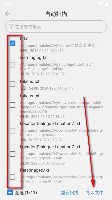 5、扫描完成后,您会在结果列表中看到所有找到的书籍文件。选中您想要导入的书籍,然后点击“导入文件”按钮。