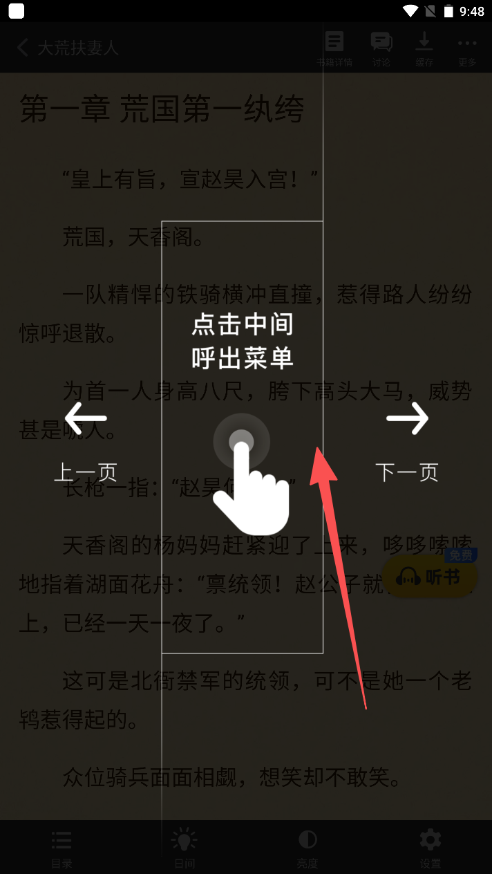 2、浏览书籍内容,点击屏幕中间唤出菜单进行操作。