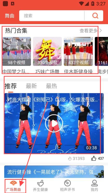 1、在广场舞曲界面可以跟着视频学习广场舞。