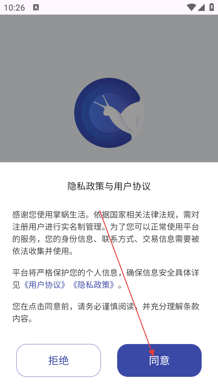 1、进入【掌蜗生活】,需先阅读【隐私政策与用户协议】,确认无误后点击【同意】,方可继续后续操作。