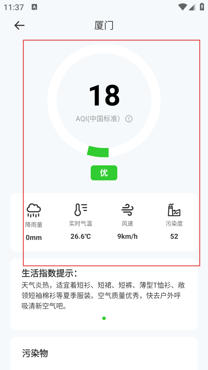 3、添加城市后,返回首页查看该城市空气质量指数及污染物数据。