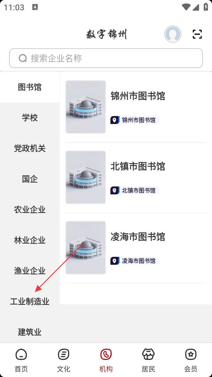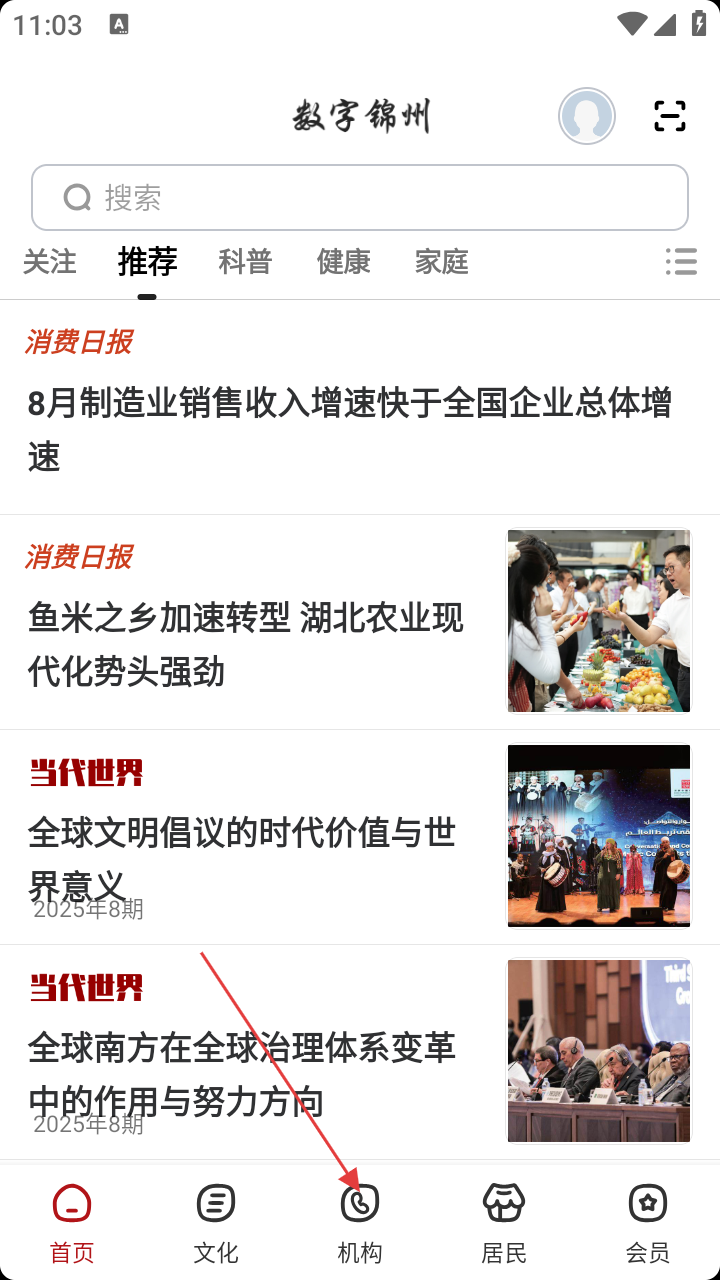 1、打开“数字锦州”APP,在首页点击底部【机构】选项,进入机构页面。