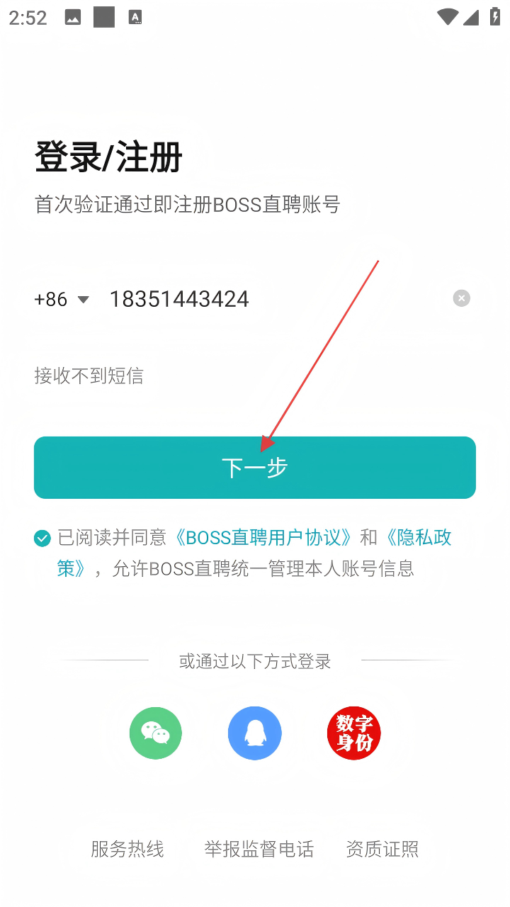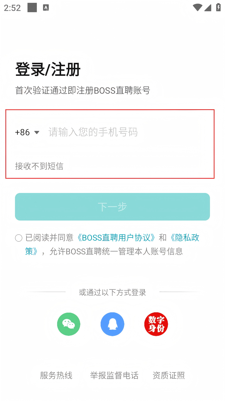 3、进入登录/注册页面后,在输入框中输入手机号码,勾选【已阅读并同意《BOSS直聘用户协议》和《隐私政策》】,然后点击【下一步】。