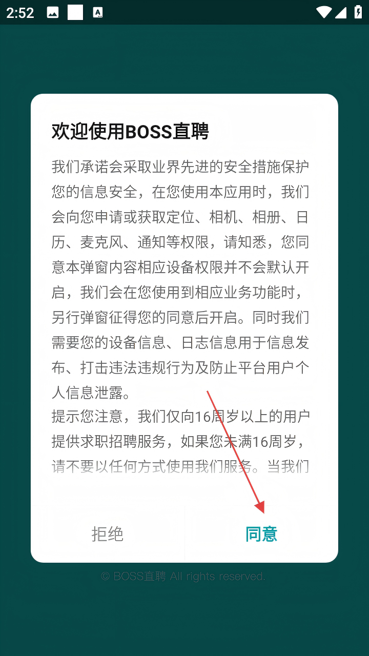 1、打开BOSS直聘APP,首先弹出权限说明弹窗,阅读后点击【同意】。